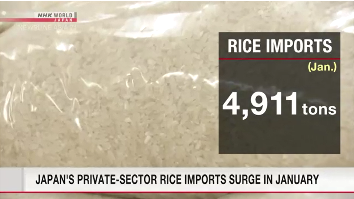 Rice imports by Japan’s private sector are rising as high prices for domestic grain drive demand for alternative supplies. The imports jumped almost 12-fold in January from
