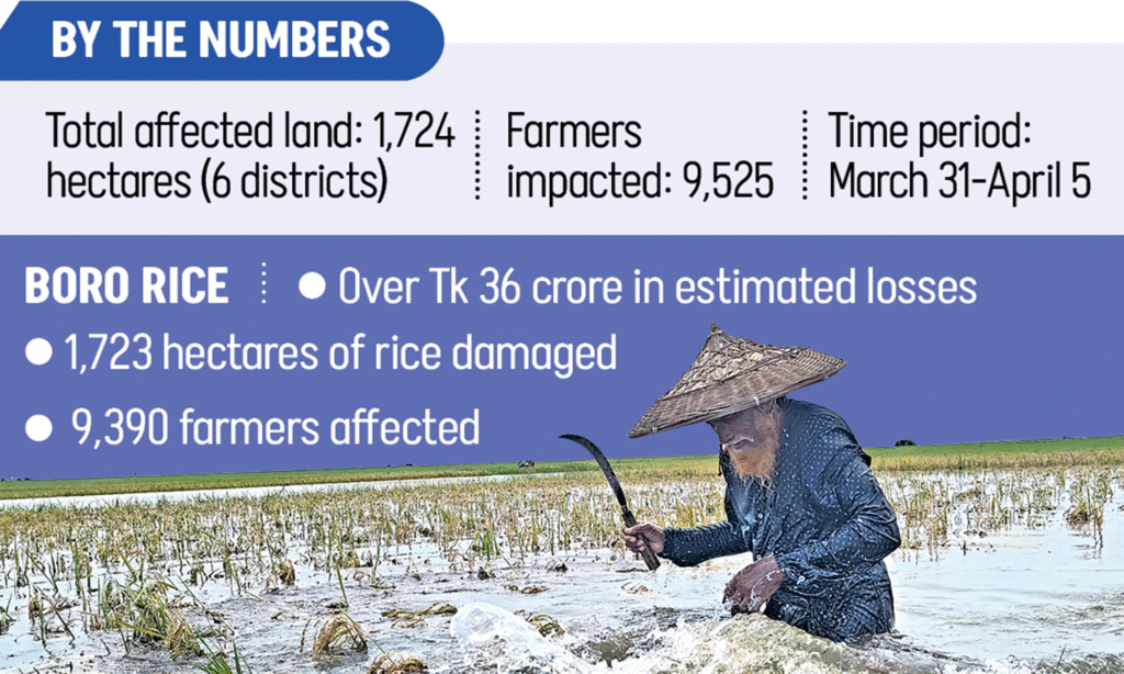 Boro rice bore the brunt of the damage, covering 1,723 hectares. Total losses are estimated at over Tk 36.36 crore, affecting 9,390 farmers.
