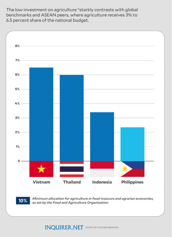The comparative ASEAN data reveals that Vietnam allocates 6.5 percent of its national budget to agriculture; Thailand, 5.99 percent; and Indonesia, 3.4 percent, all exceeding the percentage the sector receives in the Philippines.
