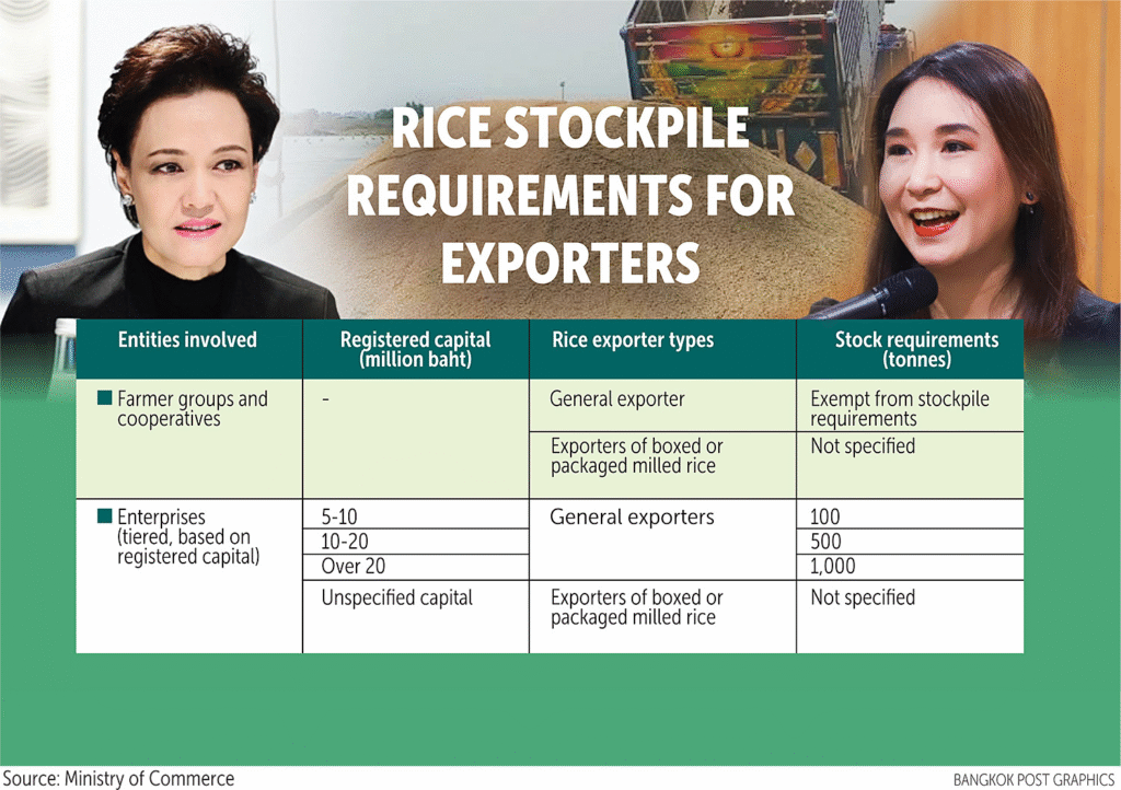 The rice stockpiling requirement has been under the spotlight following a debate between caretaker Commerce Minister Suphajee Suthumpun and Sirikanya Tansakun, deputy leader of the People’s Party, over whether the requirement should be abandoned.