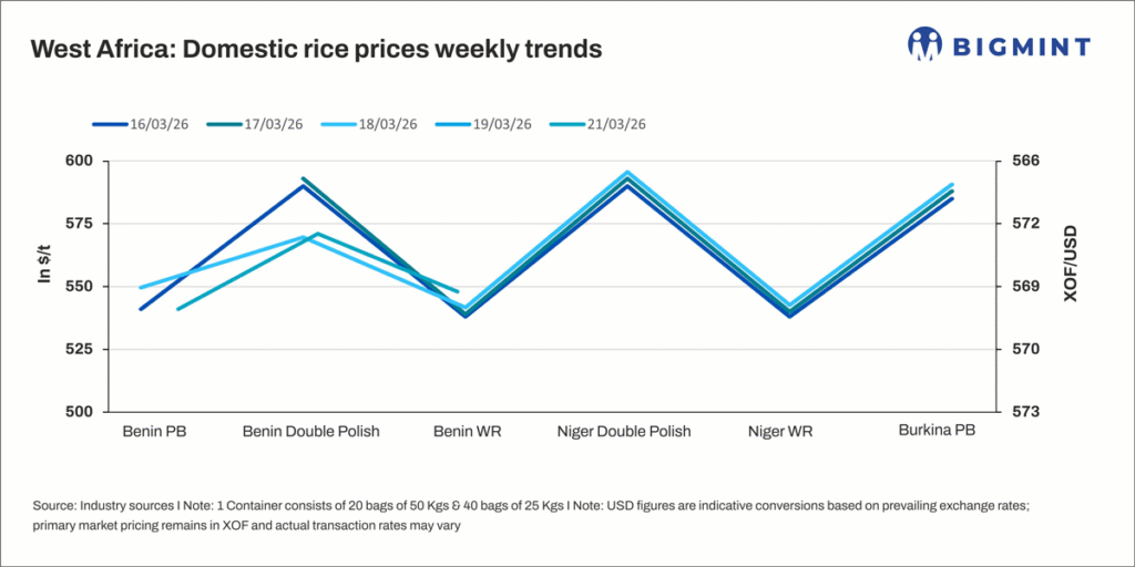 In contrast, white rice prices increased from $538/t to $548/t, supported by steady demand. Double polished (DP) rice showed volatility, declining from $593/t on 17 March to $568/t on 18 March before recovering to $571/t, reflecting opportunistic buying at lower levels. Meanwhile, fluctuations in the XOF/USD exchange rate, moving between 573 and 566, continued to impact import parity, with a relatively stronger local currency towards the end of the period capping upside in landed prices.